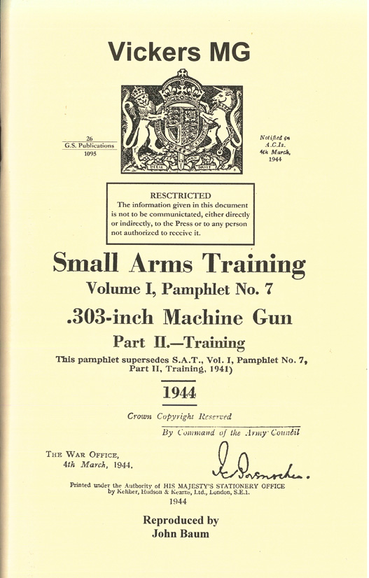 1944 dated Vickers MG training manual. 128 pages, 8.5h x 5.5"w. See